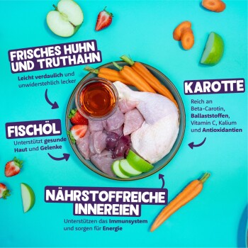 Präbiotika in der Rezeptur können die Verdauung deines Hundes unterstützen und ihm helfen, sich rundum wohlzufühlen. Die spezielle Mischung aus pflanzlichen Inhaltsstoffen ergänzt die Mahlzeit und macht sie zu einer außergewöhnlichen Wahl für deinen Hund. Ohne den Zusatz von Zucker oder Konservierungsmitteln ist dieses Rezept ideal für anspruchsvolle Vierbeiner. Probiere es aus und überzeuge dich selbst, wie sehr dein Hund es genießen wird.
