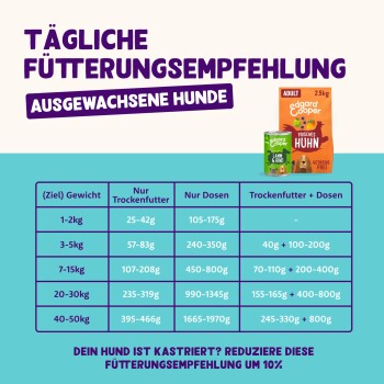 | Gewicht des Tieres | Menge Nassfutter + Menge Trockenfutter |
