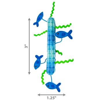 KONG Kickeroo Stickaroo bietet eine vielseitige sinnliche Bereicherung in einer langen, weichen Form, die ein gesundes Ringen mit dem ganzen Körper und das Treten mit den Hinterpfoten anregt. Schnörkelige Algen und ein Schwarm auffälliger, glänzender Fische, die mit Gummibändern angebunden sind, laden zu dynamischen Zuschlagen und Springen bei "Unterwasser"-Abenteuern ein. Ebenso dient das Spielzeug hervorragend zur Befriedigung der Fang- und Greifinstinkte. Knistergeräusche und KONG Premium North American Catnip am ganzen Stab animieren mit jeder Bewegung zu natürlichem, befriedigendem Spaß.