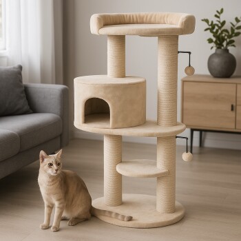 Dank der bequemen und extra großen Liegeflächen mit hohem Liegekomfort haben deine Katzen genügend Platz zum Ausruhen. Die sechs dicken Kratzsäulen (Ø 15cm) bieten genügend Fläche für einen unbegrenzten Kratzspaß. Der Kratzbaum ist für kleine bis große Katzen, sowie Haushalte mit mehreren Katzen geeignet. Dank der zwei Plüschbälle wird auch der Spieltrieb deiner Katze befriedigt.  Die extra dicke, stabile Bodenplatte mit Anti-Rutsch-Füßen sorgt für einen stabilen Stand.